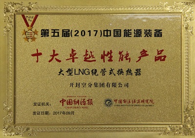 9月20日,由中國能源報社、中國能源經(jīng)濟研究院共同舉辦的首屆(2017)中國能源產(chǎn)業(yè)發(fā)展年會在北京召開。國家能源局總監(jiān)李冶出席會議并致辭。會議對第五屆中國能源裝備十大卓越性能產(chǎn)品進(jìn)行了頒獎,開封空分大型LNG繞管式換熱器獲此殊榮。
